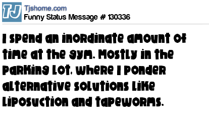 X I spend an inordinate amount of time at the gym. Mostly in the parking lot, where I ponder alternative solutions like liposuction and tapeworms.