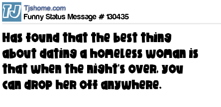 - # 125114 The best thing about dating a homeless woman is that when the night's over, you can drop her off anywhere.