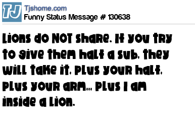 X Lions do NOT share. If you try to give them half a sub, they will take it, plus your half, plus your arm,,, plus I am inside a lion.