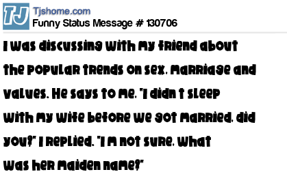 - # 45232 I was discussing with my friend about the popular trends on sex, marriage and values. He says to me “I didn't sleep with my wife before we got married, did you? I replied. “I'm not sure, what was her maiden name?”