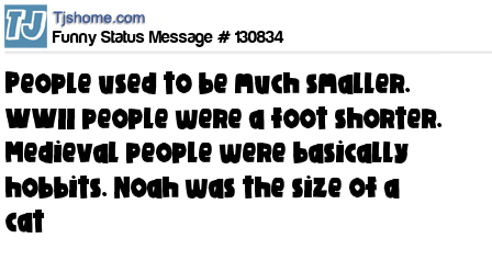 X People used to be much smaller. WWII people were a foot shorter. Medieval people were basically hobbits. Noah was the size of a cat