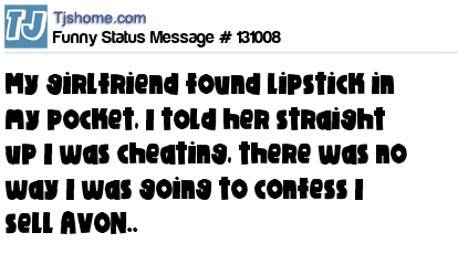 - # 158925 My wife found lipstick in my pocket. I straight up told her I'm cheating. There no way I'm telling her I'm selling Avon.