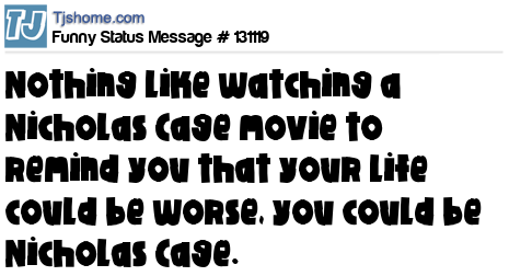 X says Nothing like watching a Nicholas Cage movie to remind you that your life could be worse, you could be Nicholas Cage.
