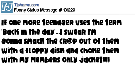 X If one more teenager uses the term 'Back in the day'...I swear I'm gonna smack the Cr@p out of them with a floppy disk and choke them with my Members Only jacket!!!