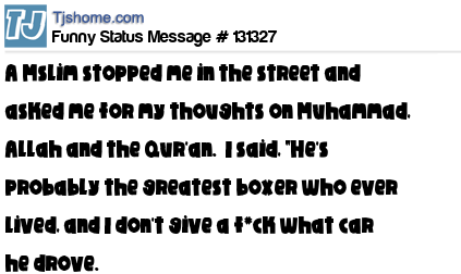 X A Mslim stopped me in the street and asked me for my thoughts on Muhammad, Allah and the Qur'an. I said, "He's probably the greatest boxer who ever lived, and I don't give a f*ck what car he drove.