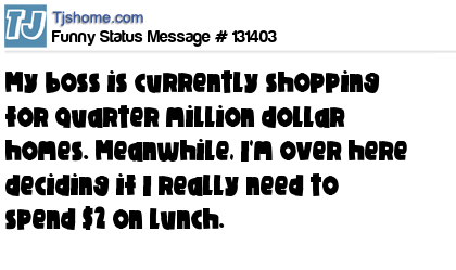 X says My boss is currently shopping for quarter million dollar homes. Meanwhile, I'm over here deciding if I really need to spend $2 on lunch.
