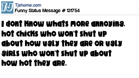 X says I dont know whats more annoying, hot chicks who won't shut up about how ugly they are or ugly girls who won't shut up about how hot they are.