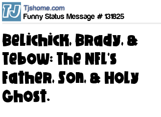 - # 131843 BRADY: Sup. TEBOW: Sup. BRADY: What have you been up too? TEBOW: Studying the Bible. What about you? BRADY: Banging Gisele Bundchen. [Awkward Silence]