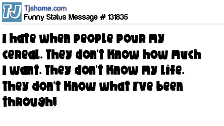 - # 125774 I hate when people pour my cereal. They don't know how much I want! They don't know my life! They don't know what I've been through!!!