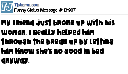 X has My friend just broke up with his woman. I really helped him through the break up by letting him know she's no good in bed anyway.