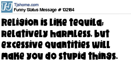 X says Religion is like tequila; relatively harmless, but excessive quantities will make you do stupid things.