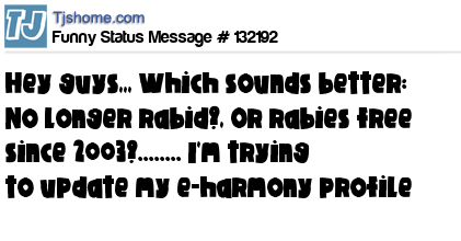 X Hey guys,,, Which sounds better: No longer rabid?, Or rabies free since 2003?........ I'm trying to update my e-harmony profile
