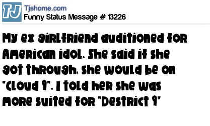 X My ex girlfriend auditioned for American idol. She said if she got through, she would be on "Cloud 9". I told her she was more suited for "Destrict 9"