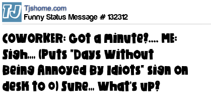 X  COWORKER: Got a minute?.... ME: Sigh,,,, (Puts "Days Without Being Annoyed By Idiots" sign on desk to 0) Sure,,, What's up?