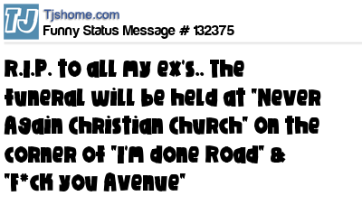 X says R.I.P. to all my ex's.. The funeral will be held at "Never Again Christian Church" On the corner of "I'm done Road" & "F*ck you Avenue"