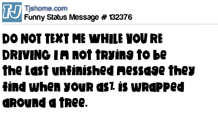 X says DO NOT TEXT ME WHILE YOU’RE DRIVING I’m not trying to be the last unfinished message they find when your as% is wrapped around a tree.