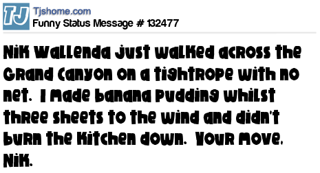 X Nik Wallenda just walked across the Grand Canyon on a tightrope with no net. I made banana pudding whilst three sheets to the wind and didn't burn the kitchen down. Your move, Nik.