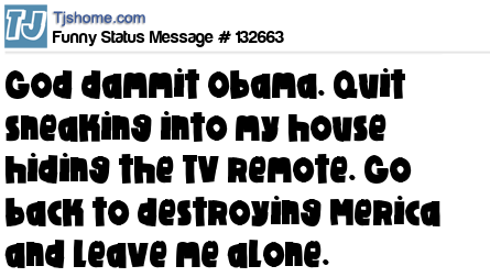 X God dammit Obama. Quit sneaking into my house hiding the TV remote. Go back to destroying Merica and leave me alone.
