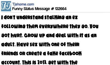 X I don't understand stalking an ex following them everywhere they go. You got hurt. Grow up and deal with it as an adult. Have sex with one of their friends or create a fake facebook account. This is 2013, get with the times.
