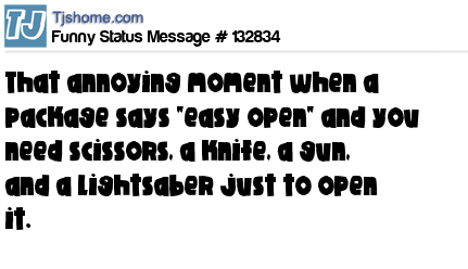 - # 66757 When a package says "Easy open" I end up using a knife, scissors, hammer, gun and a lightsaber.