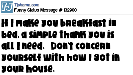 - # 120526 If I make you breakfast in bed. A simple 'Thank you.' is all I need! Not all this 'How did you get in my house?' business!