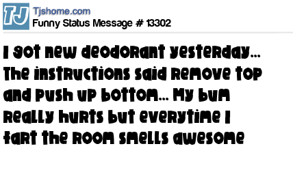- # 183155 I got new deodorant yesterday... The instructions said remove top and push up bottom... My bum really hurts but everytime I fart the room smells awesome.