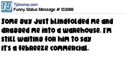 X Some guy just blindfolded me and dragged me into a warehouse. I'm still waiting for him to say it's a febreeze commercial.