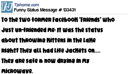 X To the two former Facebook "Friends" who just un-friended me: It was the status about throwing kittens in the lake right? They all had life jackets on..... They are safe & now drying in my microwave.