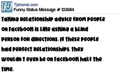 X says Taking relationship advice from people on Facebook is like asking a blind person for directions. If these people had perfect relationships, they wouldn’t even be on Facebook half the time.