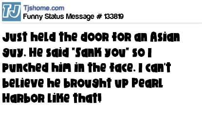 - # 106083 I just held the door open for a Japanese guy and he said, "Sank you" So I punched him in the face. I can't believe he brought up Pearl Harbor just like that.