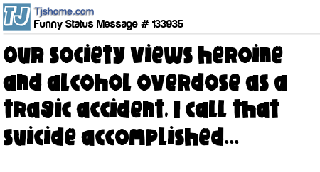 X says Our society views heroine and alcohol overdose as a tragic accident, I call that suicide accomplished...