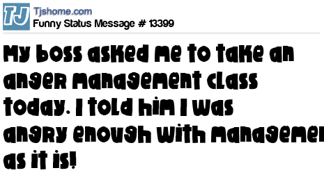 - # 182814 My boss asked me to take an anger management class today. I told him I was angry enough with management as it is
