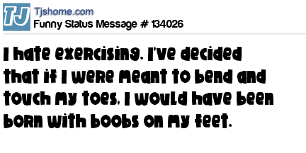 X I hate exercising. I've decided that if I were meant to bend and touch my toes, I would have been born with boobs on my feet.