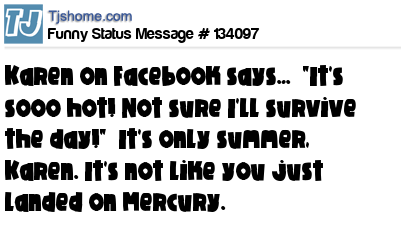 X says Karen on Facebook says… "It's sooo hot! Not sure I'll survive the day!" It's only summer, Karen. It's not like you just landed on Mercury.