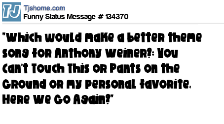 X  "Which would make a better theme song for Anthony Weiner?: You Can't Touch This or Pants on the Ground or my personal favorite, Here We Go Again?"