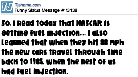 X says So, I read today that NASCAR is getting fuel injection.... I also learned that when they hit 88 mph the new cars travel through time back to 1985, when the rest of us had fuel injection.