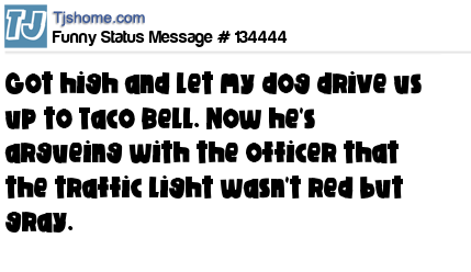X says Got high and let my dog drive us up to Taco Bell. Now he's argueing with the officer that the traffic light wasn't red but gray.