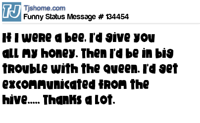 X If I were a bee, I'd give you all my honey. Then I'd be in big trouble with the queen. I'd get excommunicated from the hive..... Thanks a lot.