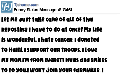 X is Let me just take care of all of this reposting I have to do at once? My life is wonderful, I hate cancer, I donated to Haiti, I support our troops, I love my Mom,I`m from Everett,Hugs and smiles to to you,I won`t join your farmville, I won`t be answering