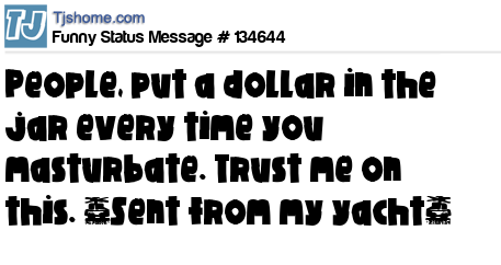 X says People, put a dollar in the jar every time you masturbate. Trust me on this. {Sent from my yacht}