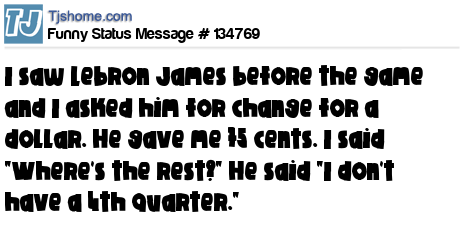 - # 178644 I asked Lebron James for change of a dollar... He gave me only three quarters. I told him he owed me another 25 cents. He told me he doesn't have a fourth quarter.