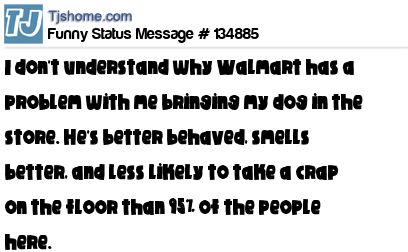 - # 147904 I don’t understand why Walmart has a problem with me bringing my dog in the store. He’s better behaved, smells better, and less likely to take a crap on the floor than 95% of the people here.