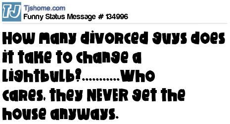 - # 208780 How many divorced men does it take to change a lightbulb? No one knows. They never get to keep the house.