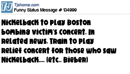 X Nickelback to play Boston bombing victim's Concert. In related news, Train to play relief concert for those who saw Nickelback.... (etc.. Bieber)