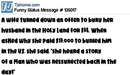 X  A wife turned down an offer to bury her husband in the Holy Land for $75. When asked why she paid $17,000 to buried him in the US, she said, "she heard a story of a Man who was ressurected back in the day!"