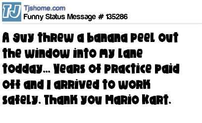 X A guy threw a banana peel out the window into my lane todday... Years of practice paid off and I arrived to work safely. Thank you Mario Kart.