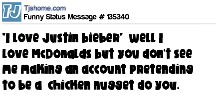 X "I love Justin bieber" well I love McDonalds but you don't see me making an account pretending to be a chicken nugget do you.