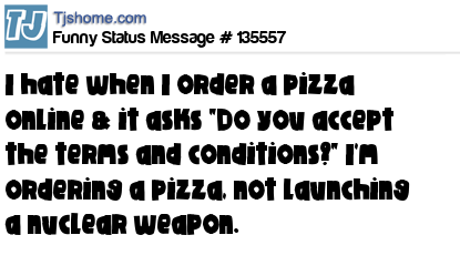 X says I hate when I order a pizza online & it asks "Do you accept the terms and conditions?" I'm ordering a pizza, not launching a nuclear weapon.