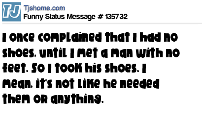 - # 157641 I once complained that I had no shoes, until I met a man with no feet. So I took his shoes. I mean seriously, it's not like he needed them or anything.