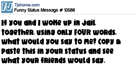 - # 33321 You and I wake up in jail together. Using only FOUR words, what would you say to me? Leave me a comment.... Then copy and paste this in your status and see what funny things your friends say....(if you make a comment you have to put this in your status)